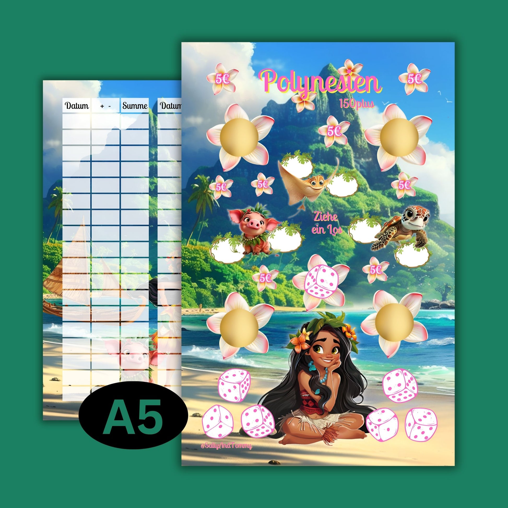 Spare in der süßen A5 Challenge im Inseldesign. Würfeln, rubbeln und abstreichen lassen dich mindestens 150 Euro Sparsumme erreichen. Wahlweise gibt es auch 6 Lose dazu. Auch ideal zum sparen für deinen nächsten Urlaub. Wenn du die Challange lochst, passt sie perfekt in deinen A6 Binder zum abheften.