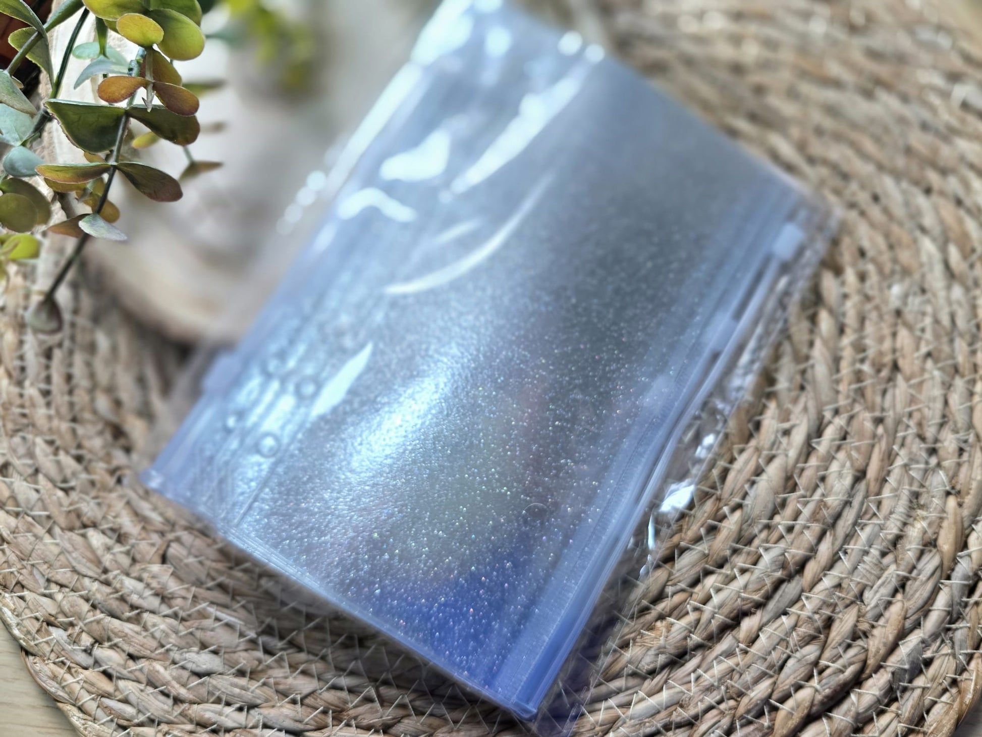 Diese A6 Glitter Hüllen sind mit Zipper und lassen sich seitlich verschließen. Sie sind transparent mit Glitzerpartikeln. Eine Packung 10 Stück.