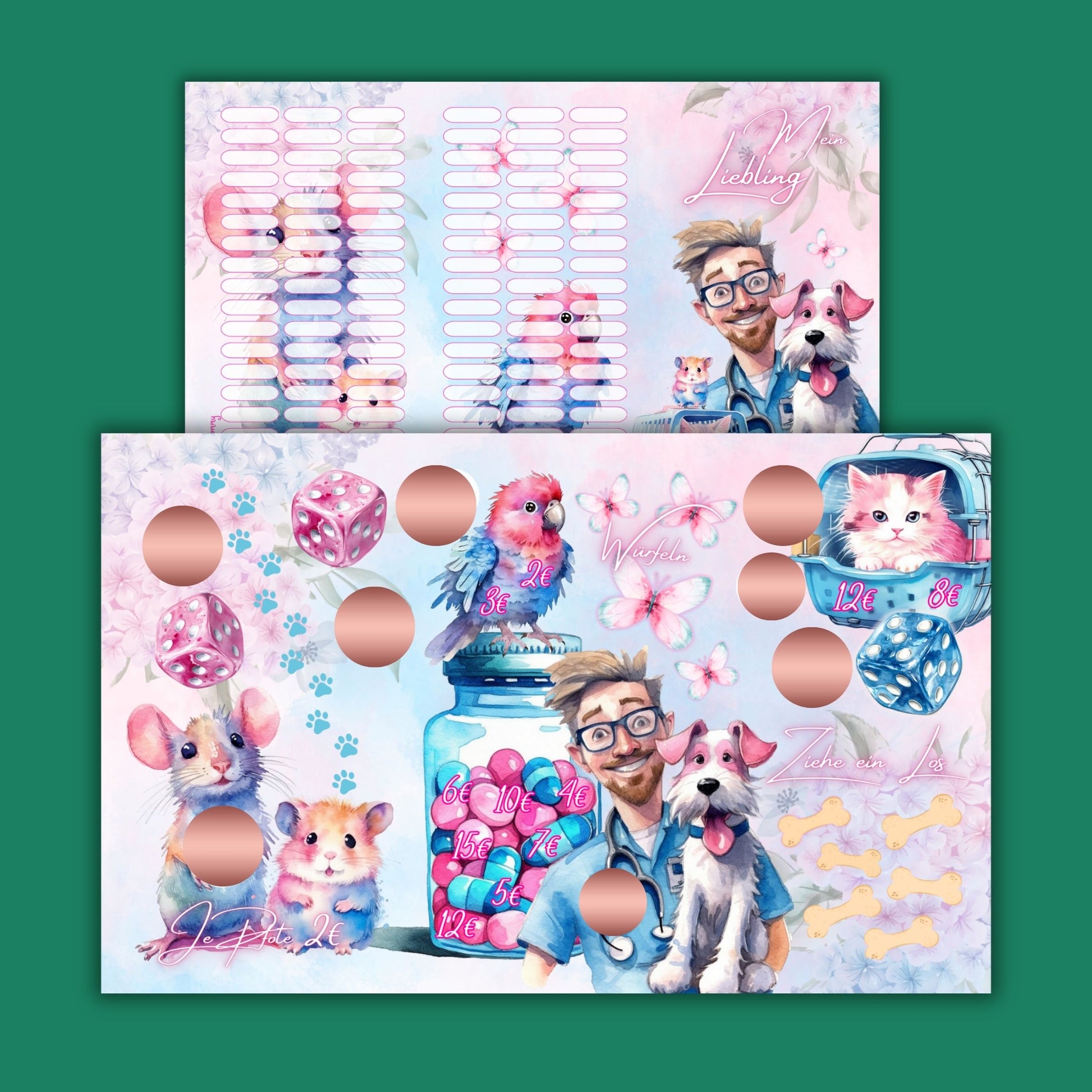 Mit dieser Klappkarte kannst du durch würfeln, rubbeln, abstreichen und wahlweise Lose ganz einfach Geld für dein Haustier sparen. Unter den Rubbelstickern befinden sich niedrige Sparbeträge von unter 10 Euro.
