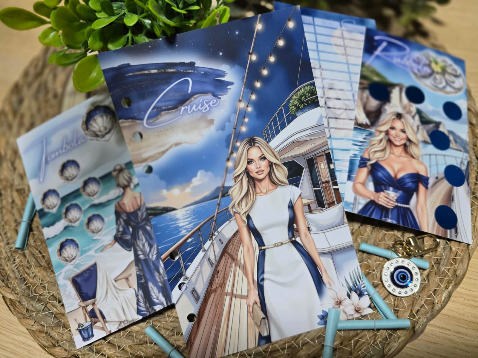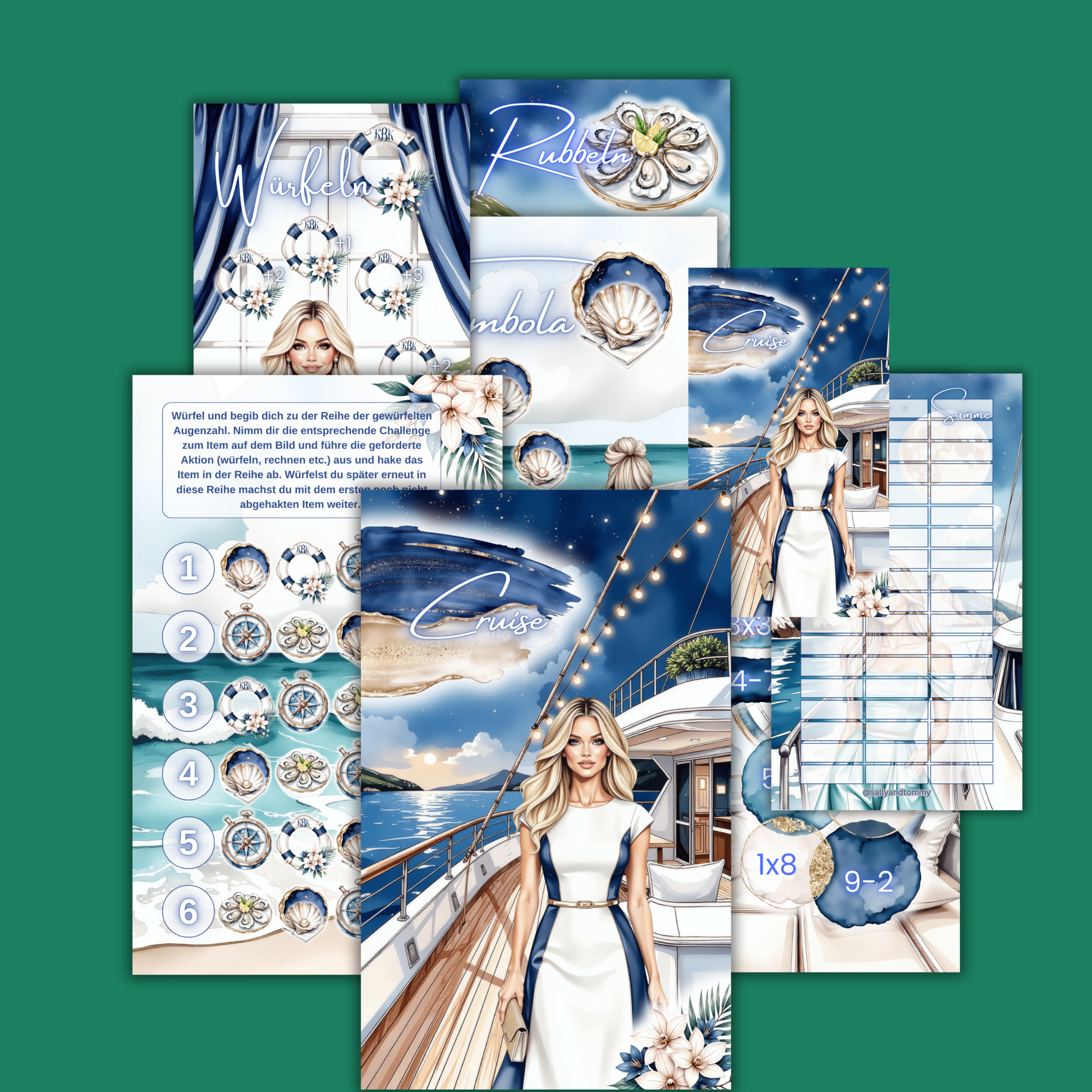 Das ist ein umfangreiches Set zum sparen für den Urlaub. Vielleicht deiner nächsten Kreuzfahrt? Über das große Spielfeld kommst du in 4 Challenges. Nutze dafür einen einfachen 6er Würfe. Eine Anleitung befindet sich auf dem Spielfeld. Du wirst zum würfeln, rubbeln, Lose ziehen und abstreichen geschickt. Das ganze Set ist matt foliert so das du mit einem Folienstift alles immer wieder neu besparen kannst. Lose sind im Lieferumfang enthalten - Würfel nicht. Dazu gibt es zu jedem Bundle einen schönen Anhänger für deinen Binder oder Schlüsselbund.