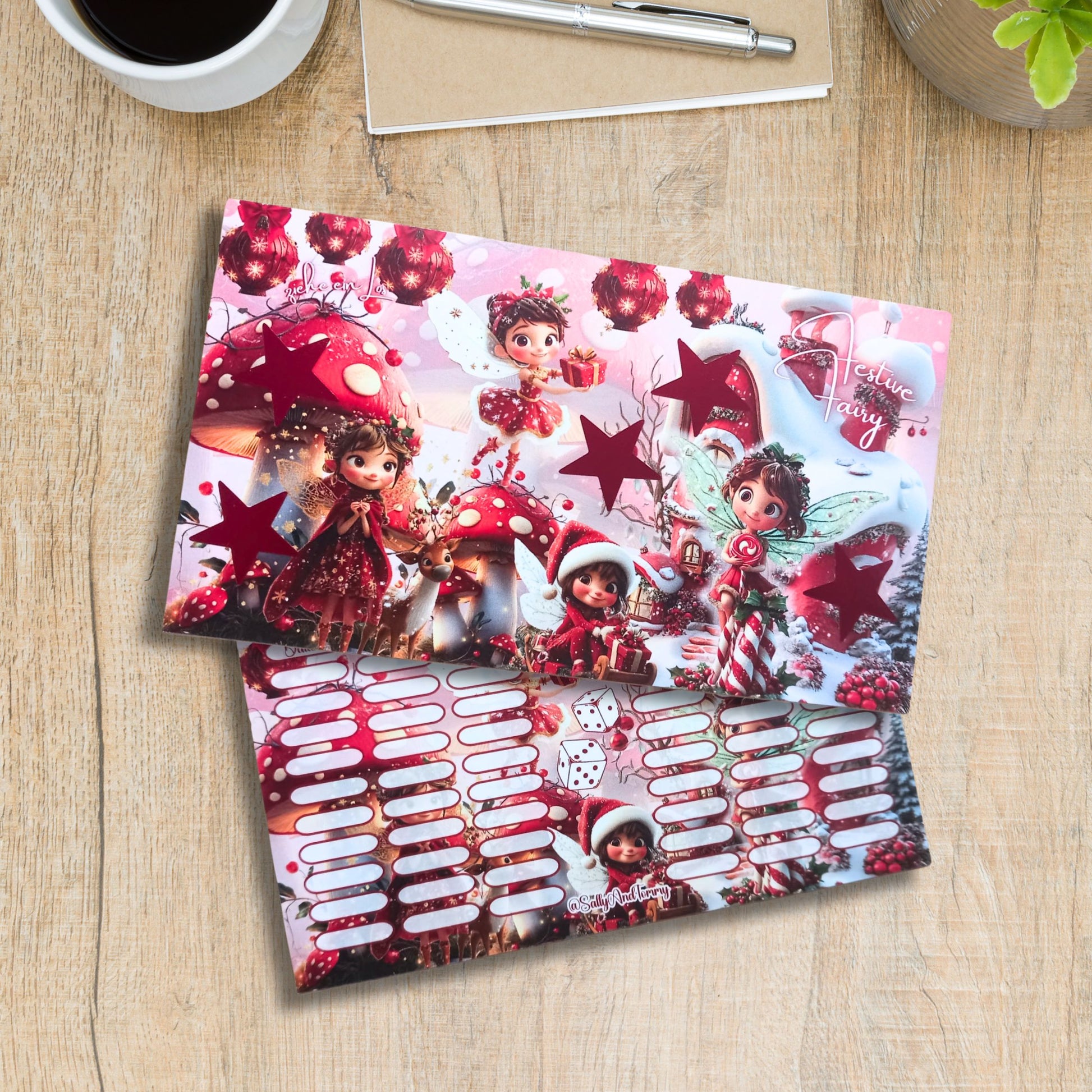 Bei dieser Sparchallenge kann man mit den süßen Feen, rubbeln, würfeln und wahlweise für jede Kugel Lose ziehen. Ideal zum sparen für Weihnachten.