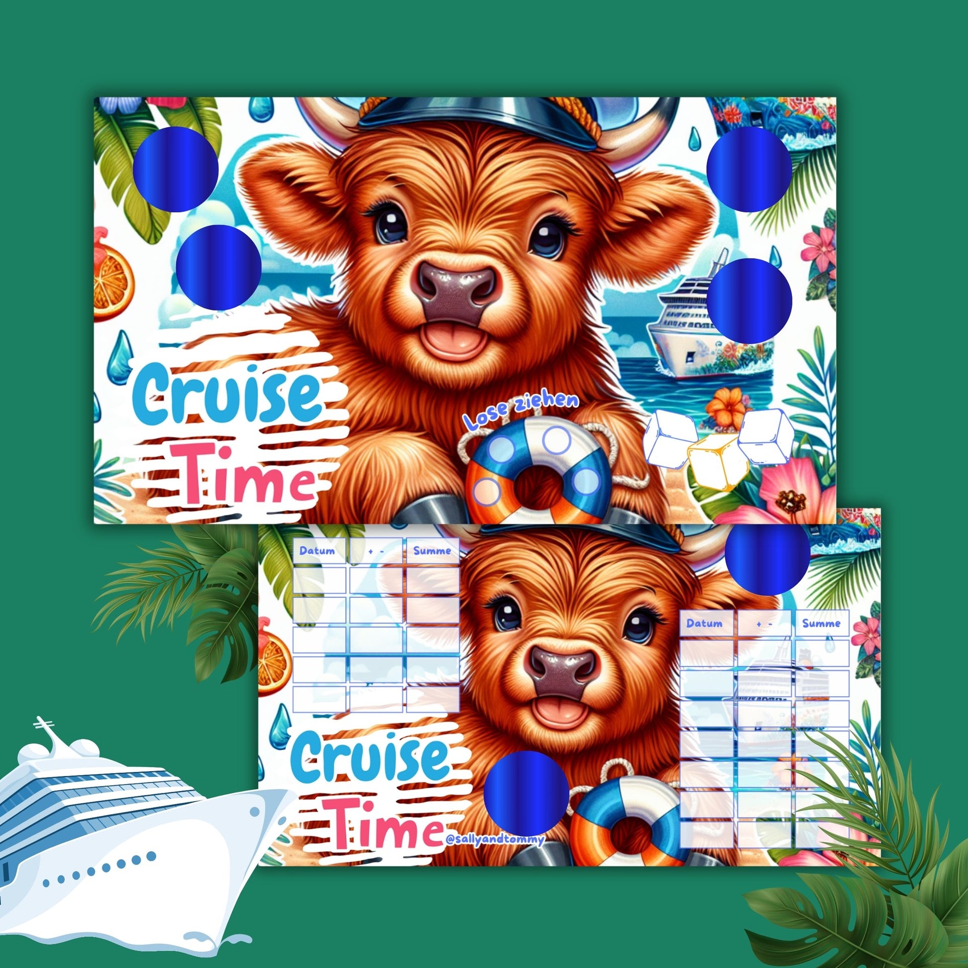 Bei dieser Sparchallenge zum Thema Kreuzfahrt kann man mit der süßen Highland Cow rubbeln, würfeln und wahlweise Lose ziehen.
