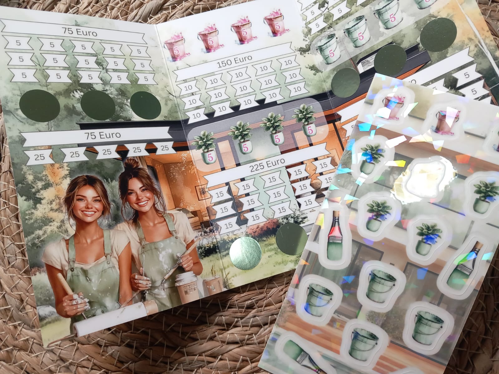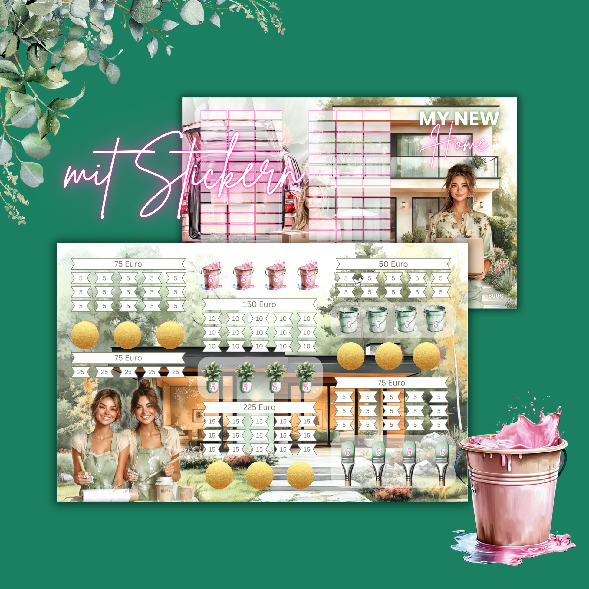 Bei dieser Klappkarte - Sparbuch kann man 800 Euro sparen. Ideal zum sparen für dein Haus, Wohnung, Eigenheim, Umzug, erste eigene Wohnung oder Renovierung. Dazu kommt ein Stickerbogen mit Stickern im passenden Design. Für das abkleben eines Items muss der entsprechende Betrag gespart werden. Alle Beträge können in Scheinen gespart werden. Hier hat sich ein Fehler eingeschlichen, die Sparsumme beträgt 850 Euro.