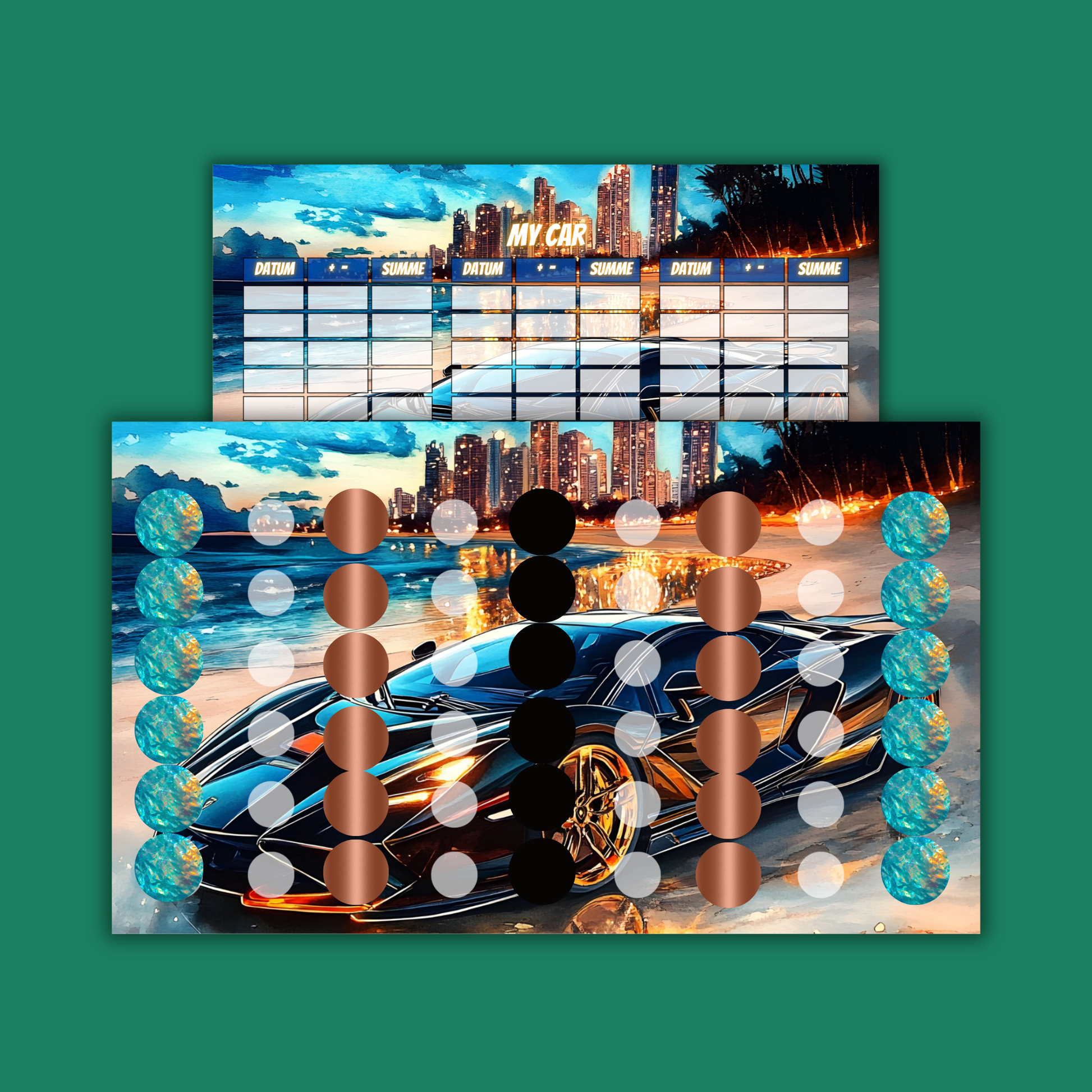 Mit dieses coolen Challenge für dein Auto kannst du durch jede Menge Rubbelfelder und wahlweise Lose ziehen in kleinen Beträgen (unter 10 Euro) sparen. Du kannst die Sparbeträge in den freien Feldern auch durch einen Würfel deiner Wahl bestimmen lassen. Auf der Rückseite befindet sich der passenden Tracker. Die Challenge wird direkt in deinen A6 Binder geheftet. Die Sparchallenge ist glänzend foliert. Nutze einen abwischbaren Folienstift und bespare die Challenge immer wieder. Auch ideal zum sparen für Auto, Reparaturen, Werkstatt, Führerschein usw.