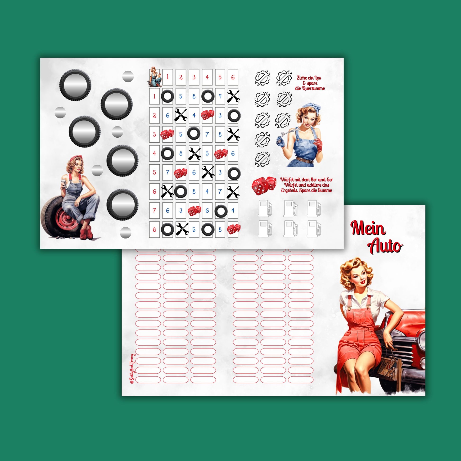 Mit dieser 3fach Klappkarte im Retro Autodesign spart man über das Bingospiel mindestens 200 Euro. Das Bingo schickt dich dann zu den Aufgaben zum rubbeln und würfeln. Wahlweise mit 6er/8er Würfel und 6 Losen. Ideal zum sparen für den Führerschein, Auto und einen Werkstattbesuch.