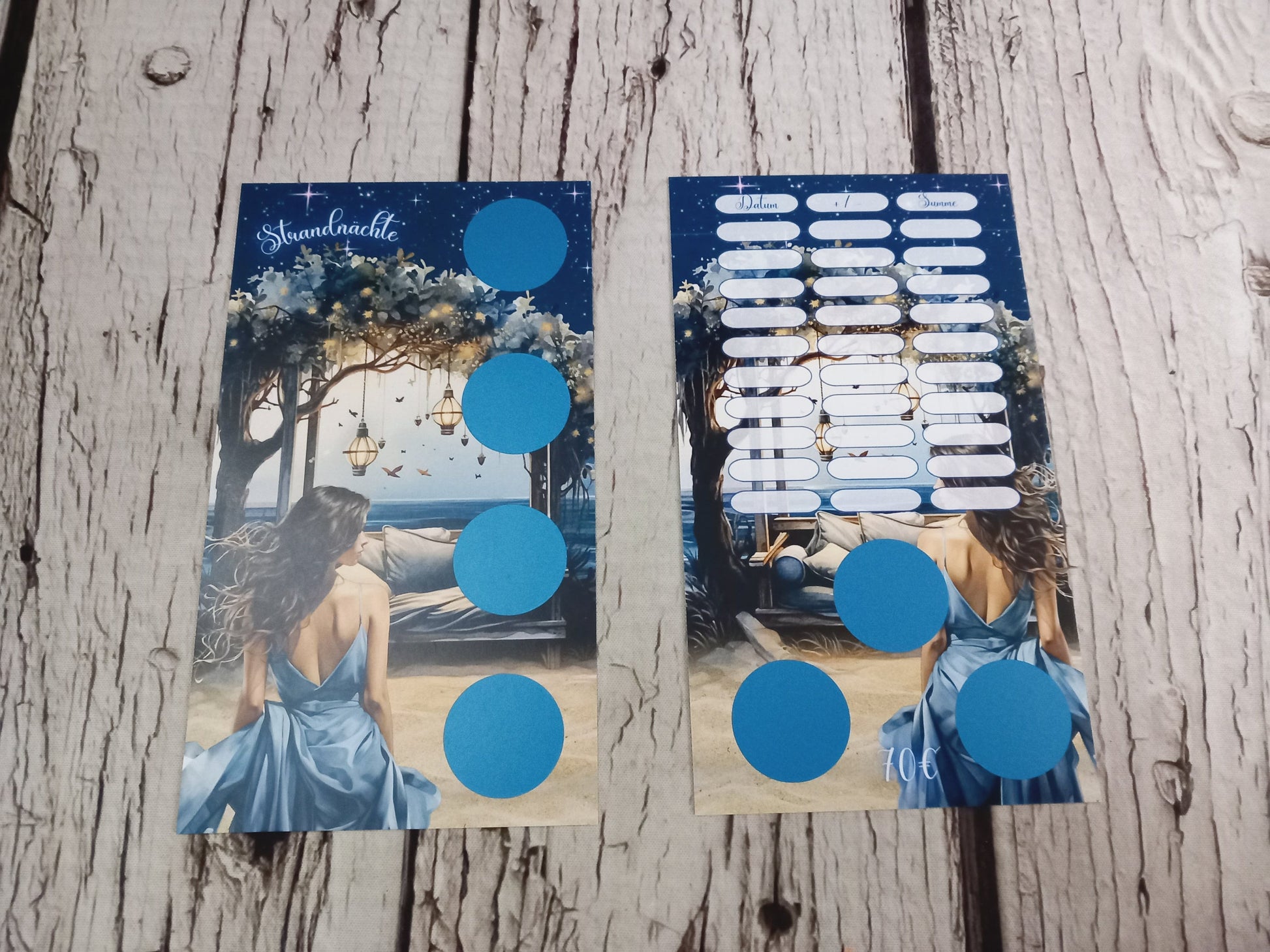 Die Rubbelchallenge Strandnächte kommt mit blauen Rubbelstickern und du kannst damit ganz einfach 70 Euro sparen. Unter den Rubbelstickern befinden sich Beträge in 5er Schritten. Auf der Rückseite befindet sich der passenden Tracker. Das Motiv bietet sich auch zum sparen für den Urlaub oder Beauty an.