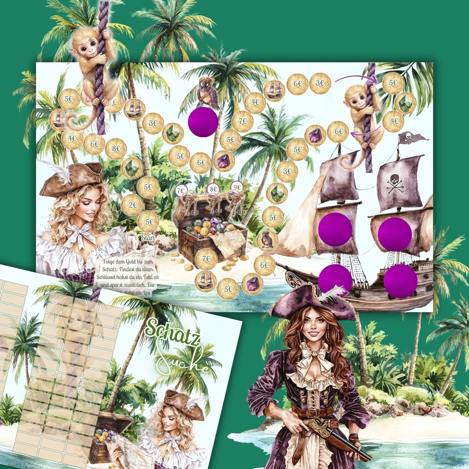 Mit dieser 3fach Klappkarte im Piratendesign folgst du einer Sparstraße aus Golddublonen. Du kannst also abstreichen, rubbeln und wahlweise auch Lose ziehen. Du willst für den nächsten Urlaub oder Sommeraktivitäten sparen? Diese Challenge passt perfekt.