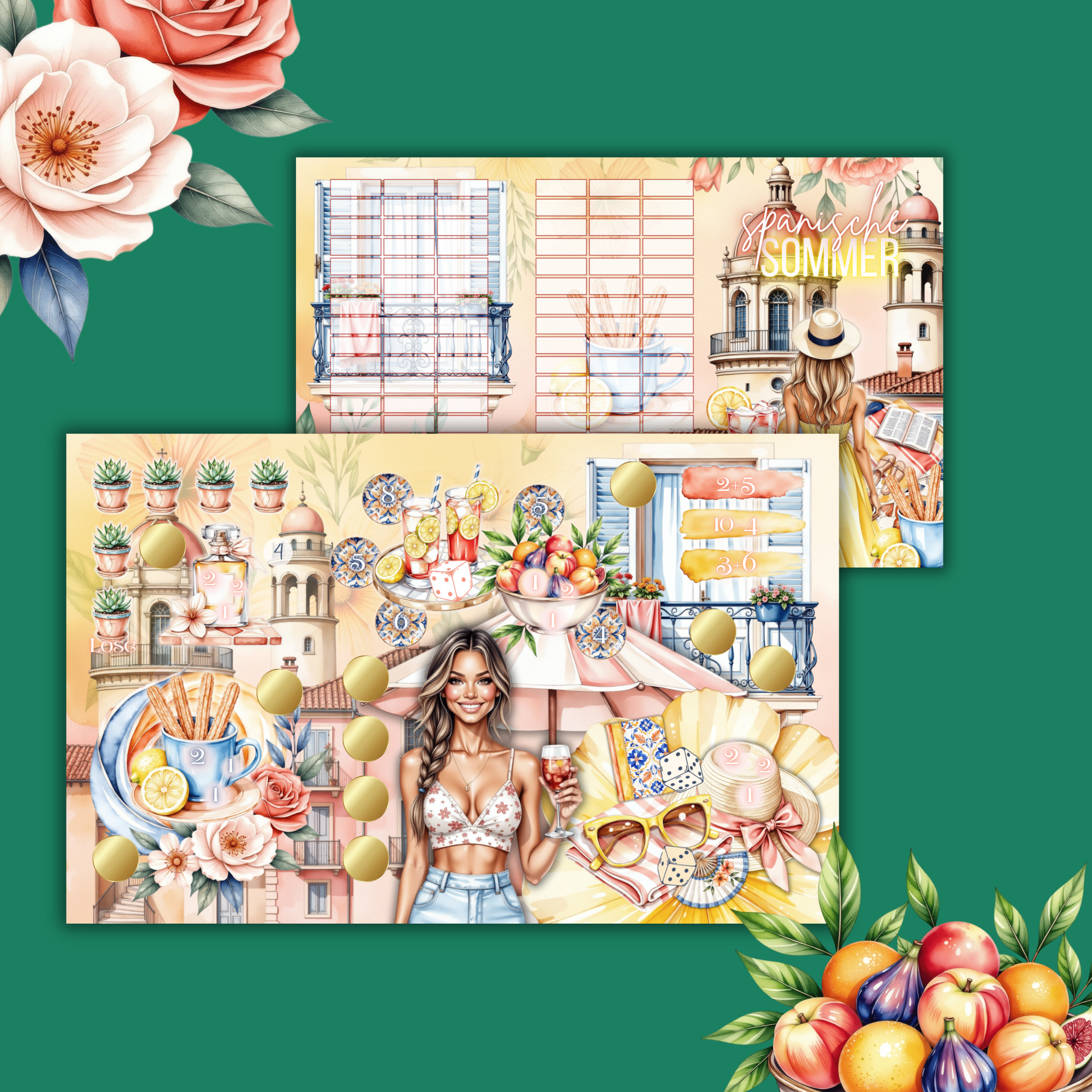 Mit dieser Challenge kannst du im sommerlichen Design sparen. Du kannst würfeln, rechnen, abstreichen, rubbeln und wahlweise auch Lose ziehen. Ideal zum sparen für den Urlaub, Weltreise oder deinen nächsten Städtetrip.