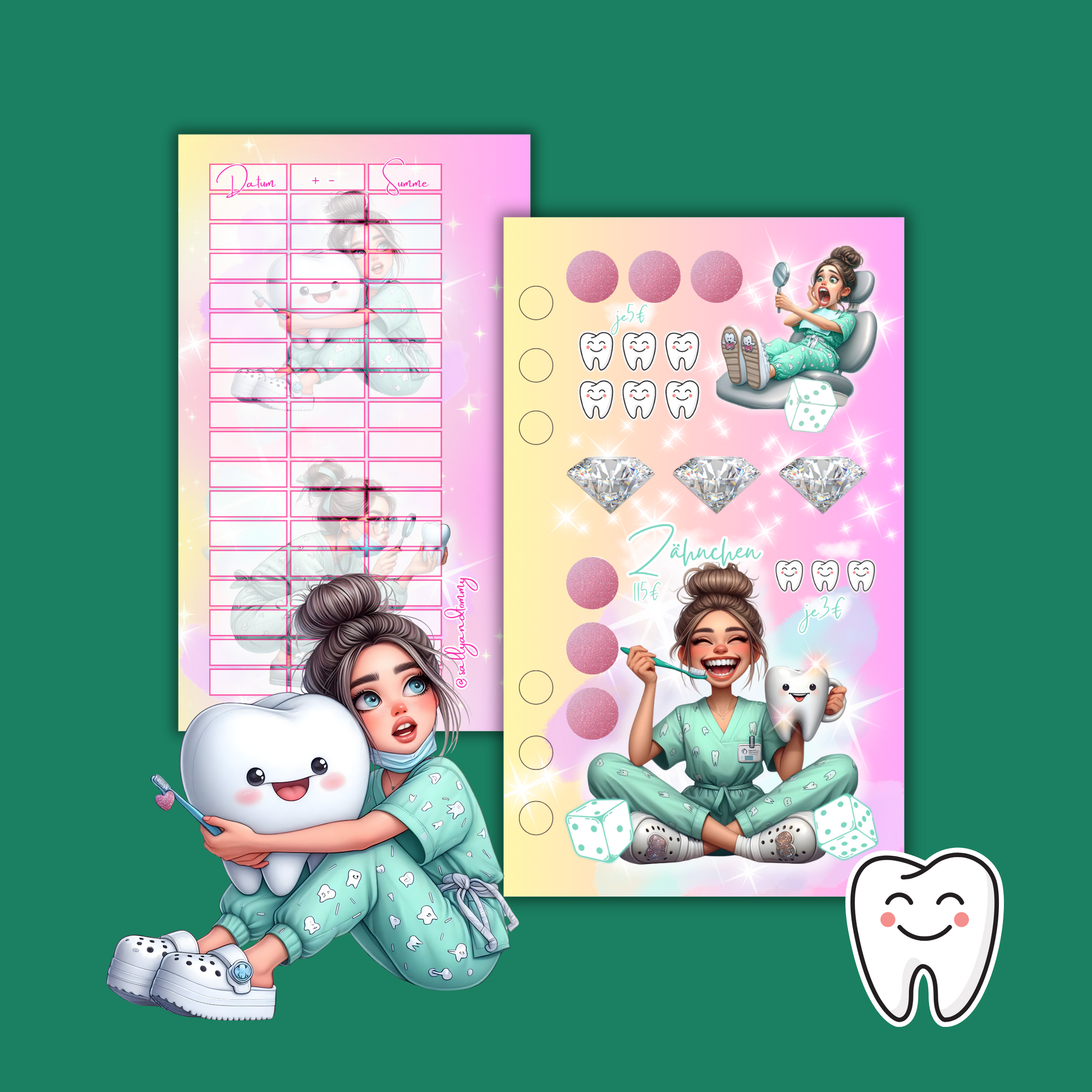Endlich können wir mit der A6 Sparchallenge Zähnchen für alles für die Zahngesundheit sparen. Ob für Zahnreinigung, Zahnersatz oder eine Zahnspange. Durch rubbeln, würfeln und ausmalen sparen für unsere Gesundheit und schöne Zähne. Die Challenge ist glänzend foliert und kann mit einem Folienstift beschrieben werden.