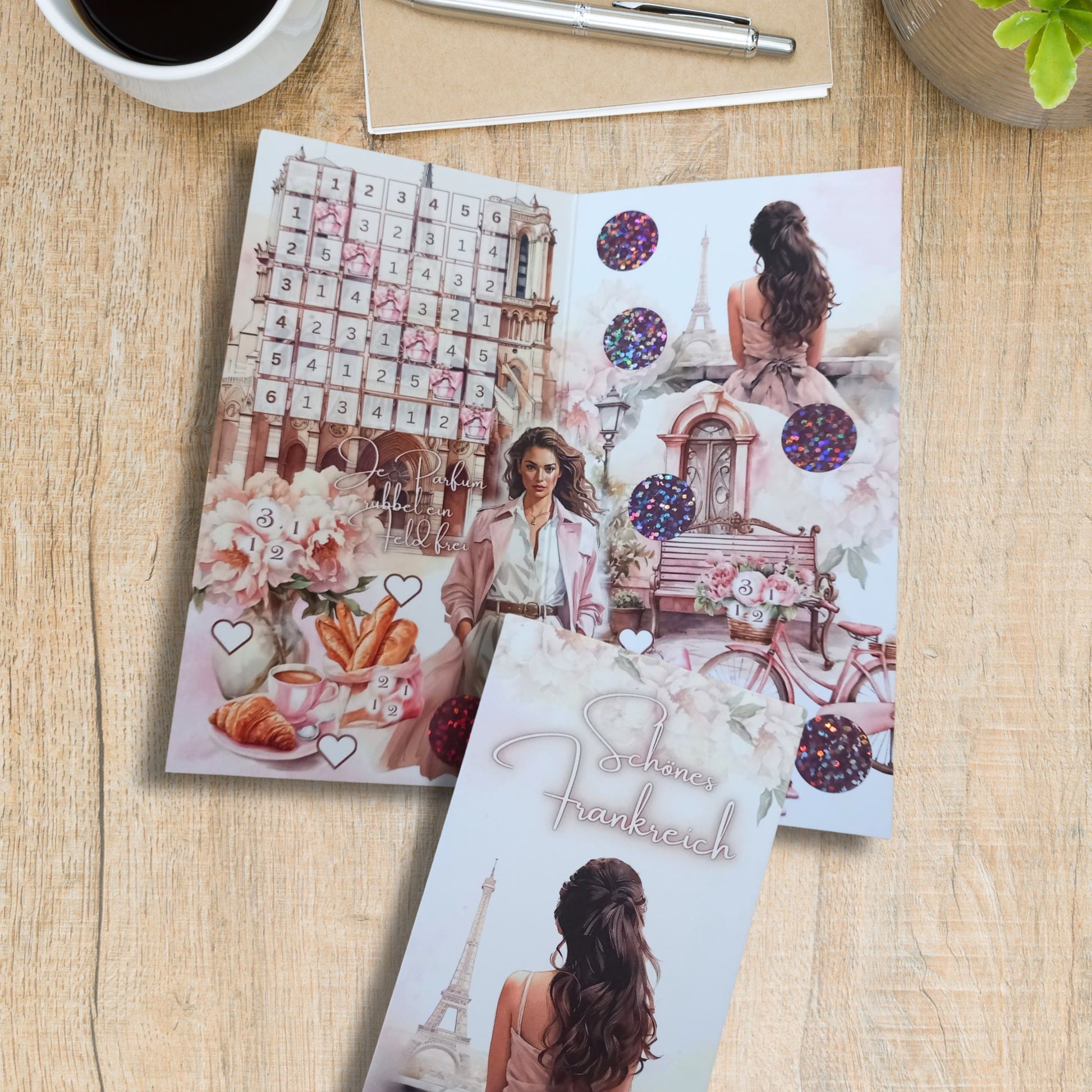 Bei dieser Klappkarte kann man ein Bingo spielen, rubbeln und Beträge abstreichen. Wahlweise kann man die Sparchallenge auch mit Losen haben. Alle Beträge unter den Rubbelstickern liegen unter 10 Euro. Für alle die Frankreich, Paris, Urlaub, rosa und Romantik mögen :-)