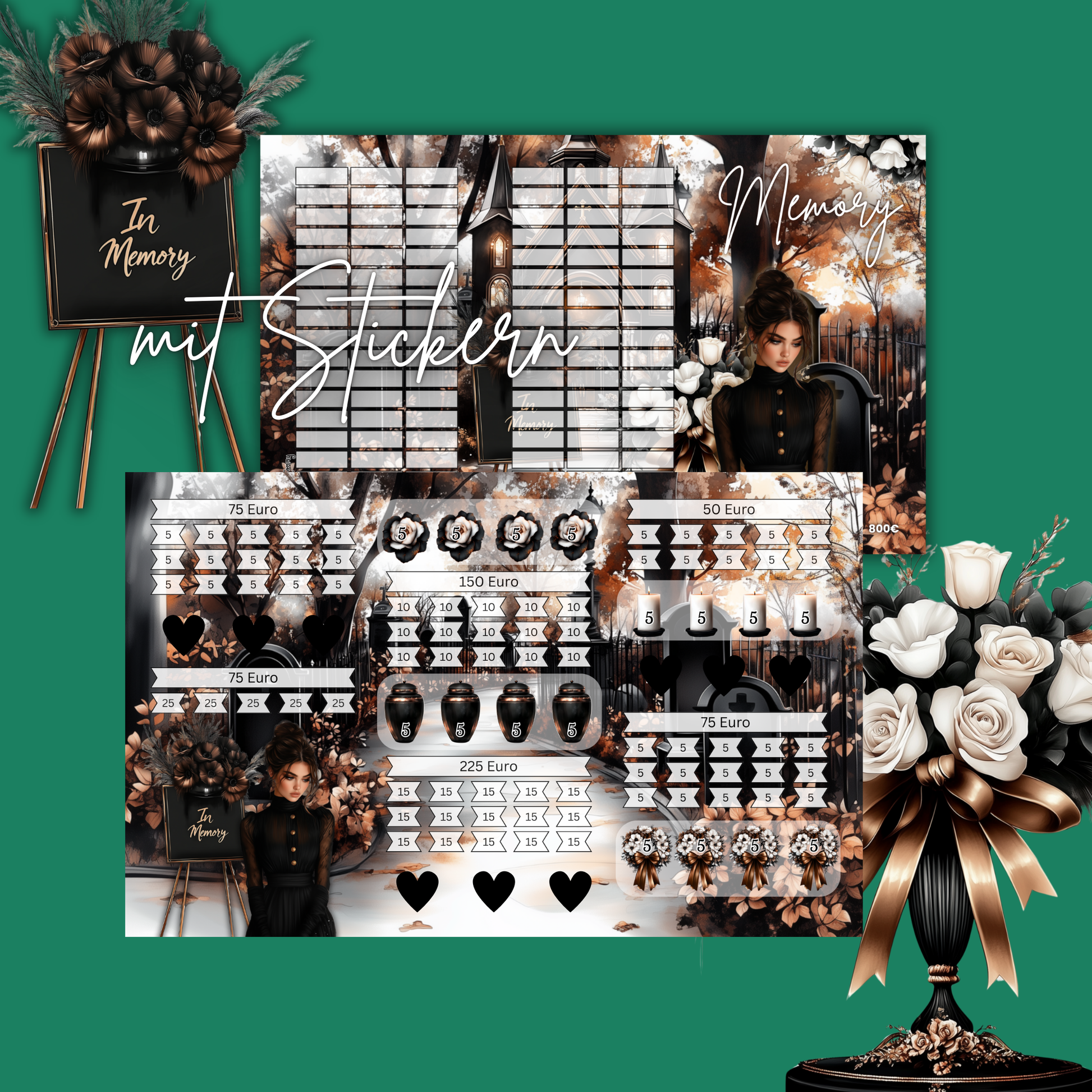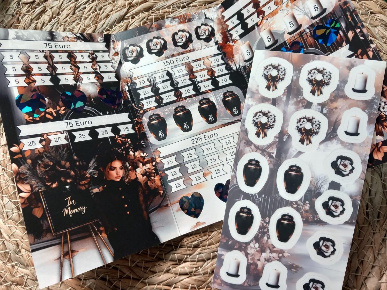 Bei dieser Klappkarte - Sparbuch kann man 800 Euro sparen. Ideal zum sparen für die Beerdigung von Mensch oder Tier. Dazu kommt ein Stickerbogen mit Stickern im passenden Design. Für das abkleben eines Items muss der entsprechende Betrag gespart werden. Alle Beträge können in Scheinen gespart werden. Hier hat sich ein Fehler eingeschlichen, die Sparsumme beträgt 850 Euro.